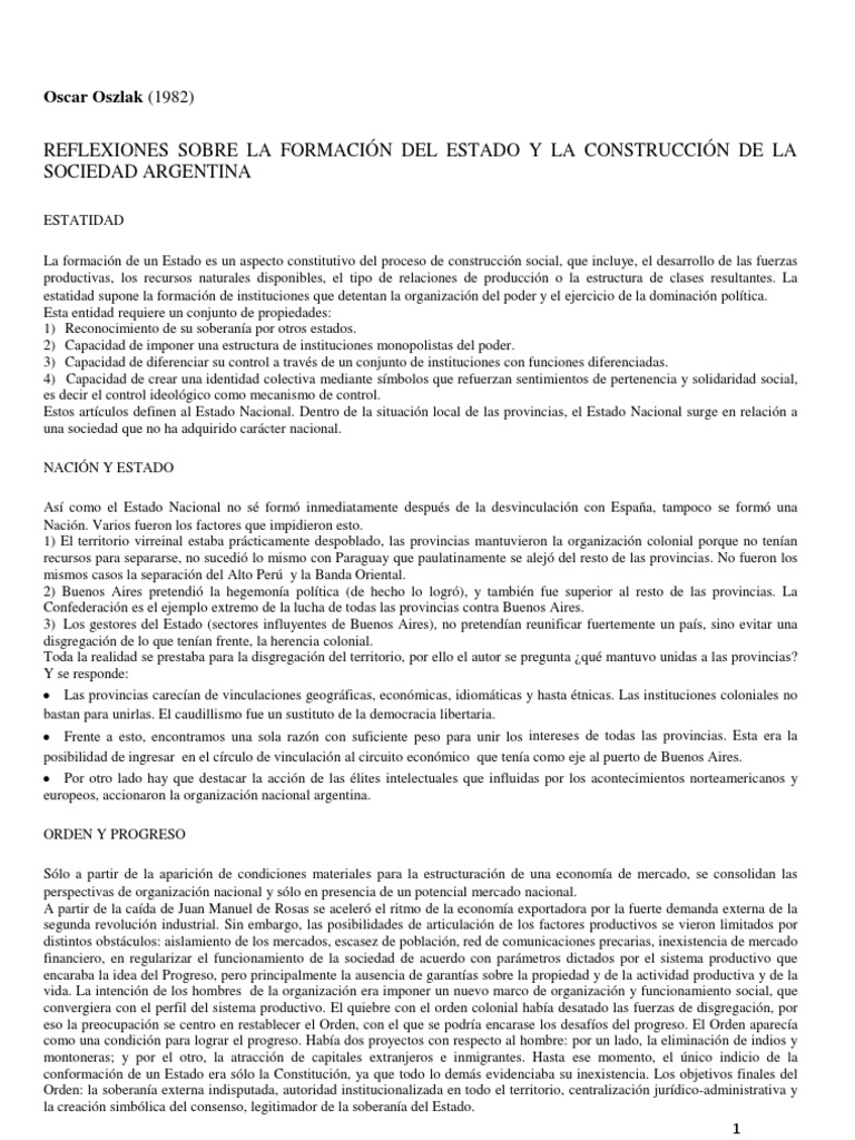 Oszlak la formacion del Estado Argentino | Estado política | Capitalismo 😈
