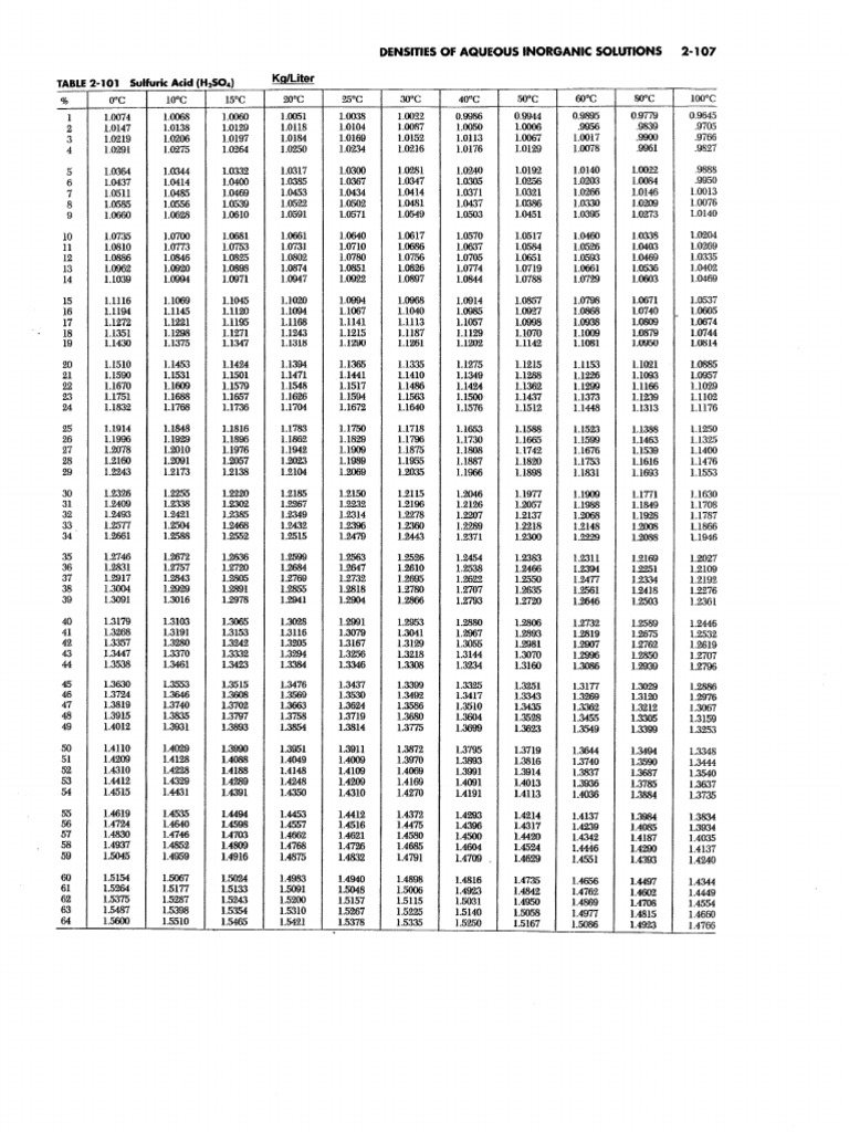 Tabla Densidad Acido Sulfurico a Diferentes Temperaturas y Concentraciones 😈
