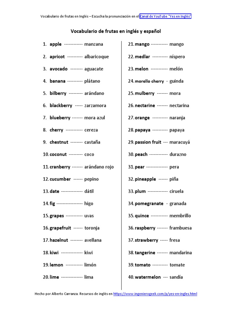 Vocabulario de Frutas en Ingles Lista de Palabras 😈