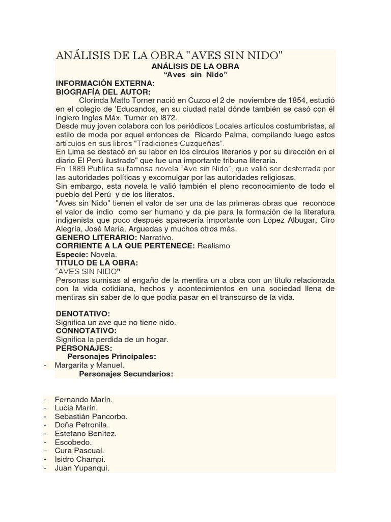 Análisis de La Obra Aves Sin Nido | PDF | Realismo literario 😈