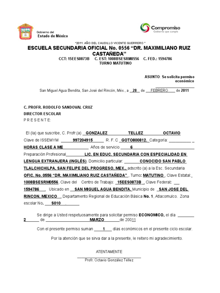 Formato de Permiso Economico | Educación Secundaria | México | Prueba ... 😈