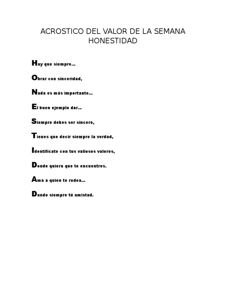 Acrostico Del Valor De La Semana Honestidad H O N E S T I D A D 😈
