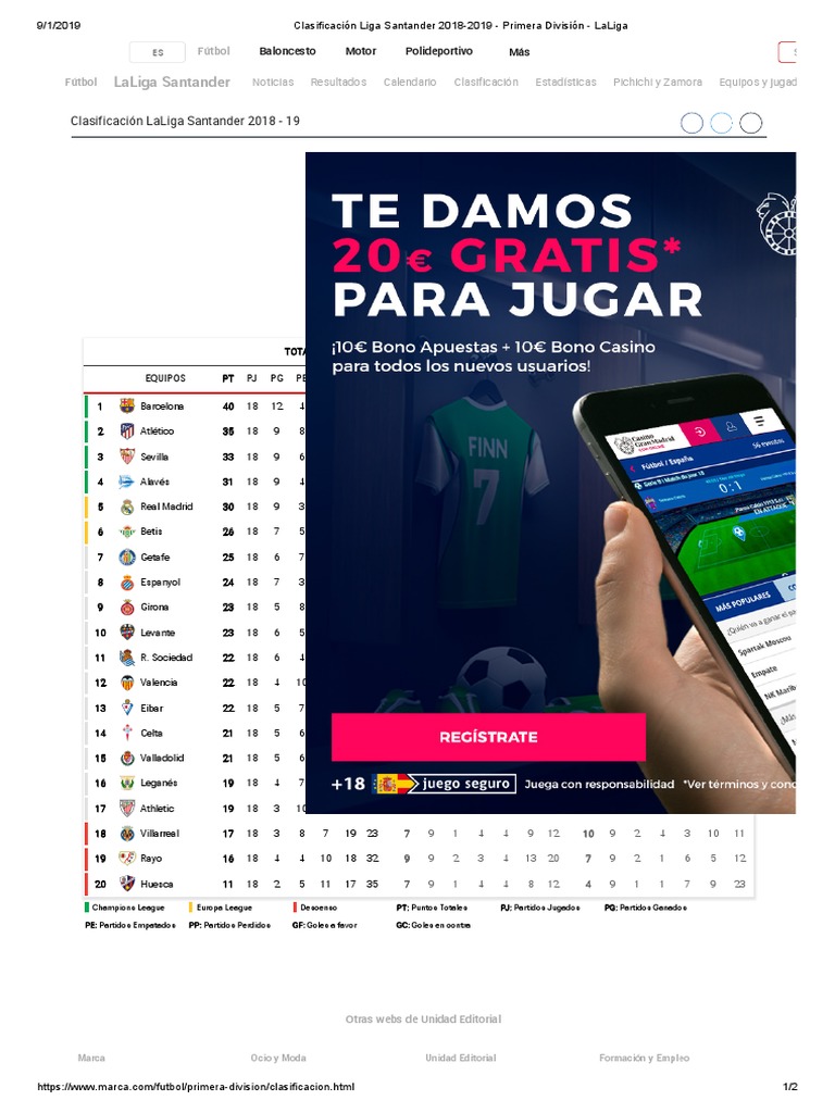 Clasificación Liga Santander 2018 2019 Primera División ... 😈