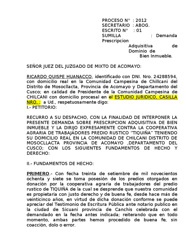 ejemplo de demanda de prescripcion adquisitiva judicial ... 😈