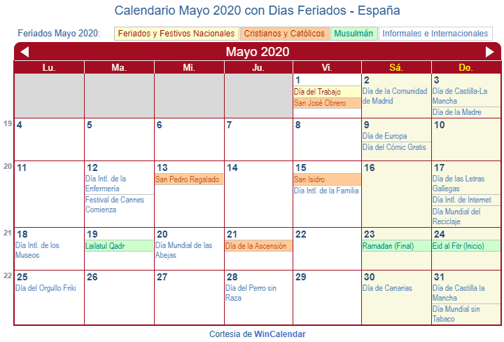 Calendario Mayo 2020 para imprimir España 😈
