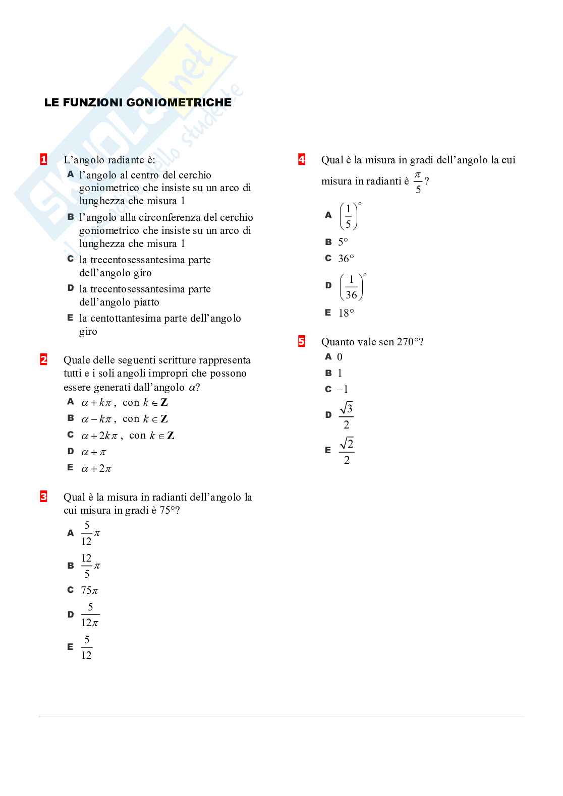 Esercitazione con domande a risposta multipla sulle funzioni goniometriche π