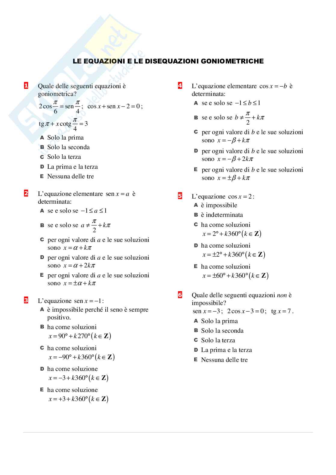 Esercitazione con domande a risposta multipla Equazioni e disequazioni ... π