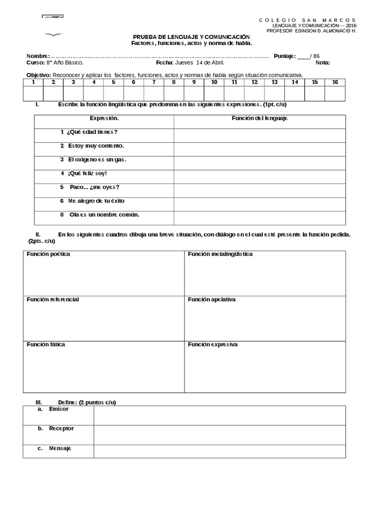 Prueba de Lenguaje y Comunicación Fatores, Funciones ... 😈