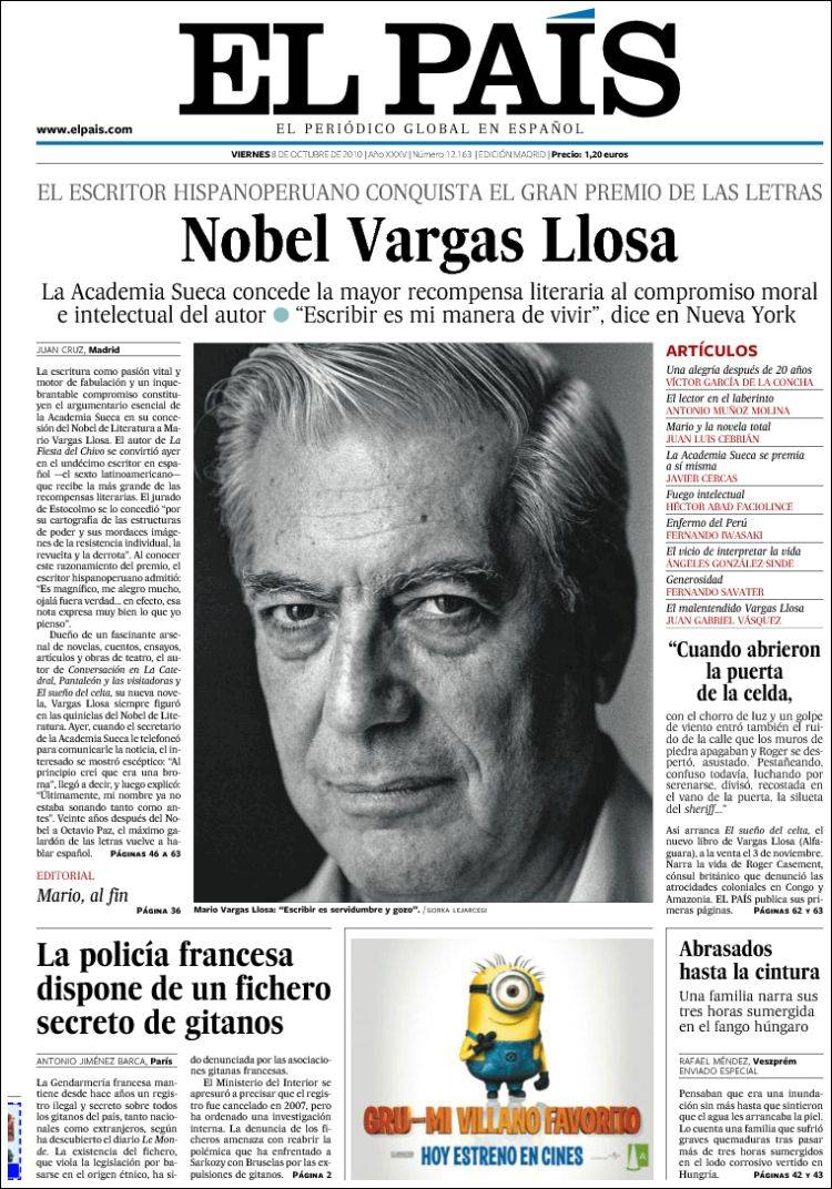 Periódicos Españoles informan sobre Premio Nobel a Mario ... 😈
