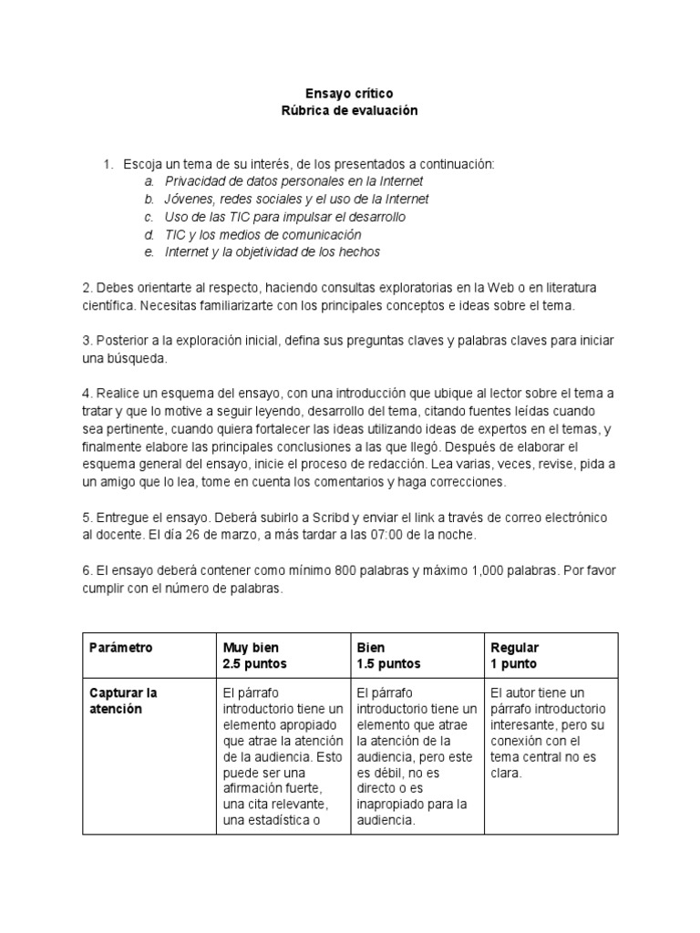 Rúbrica Ensayo Crítico | Ensayos | Gramática 😈
