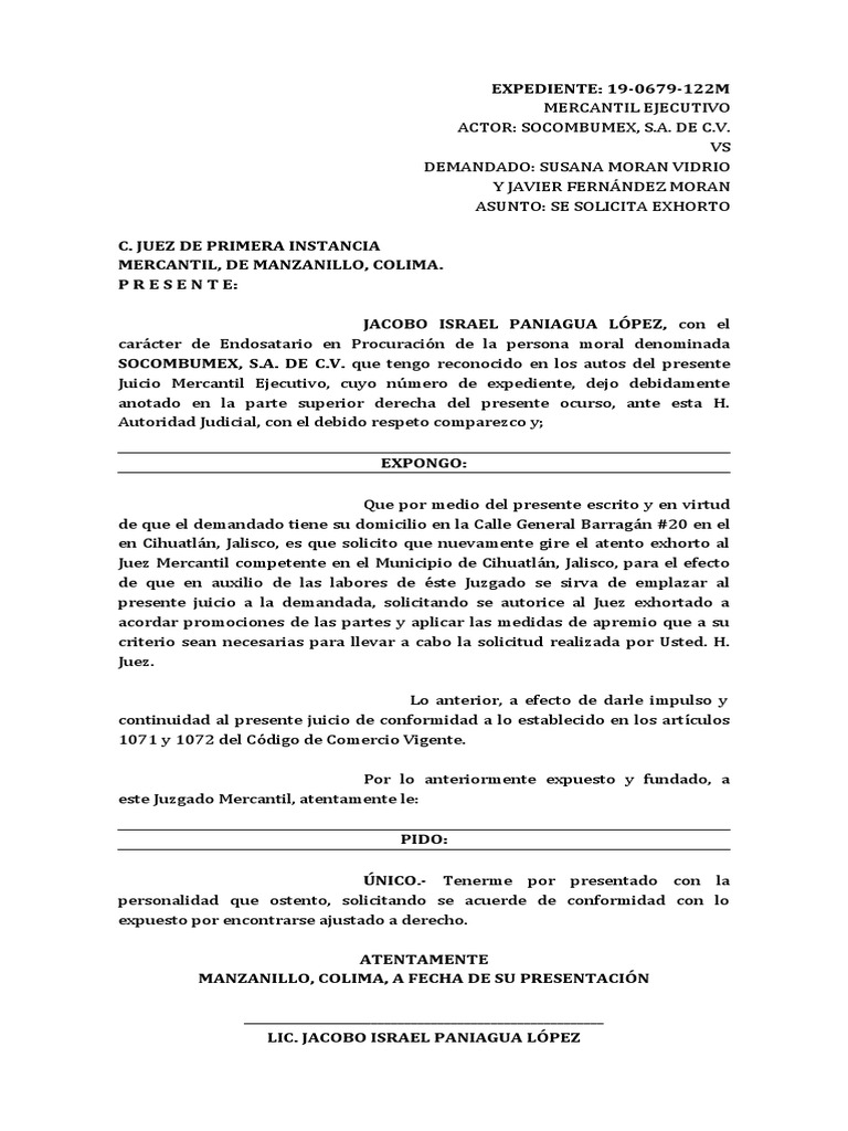 Solicitud de Exhorto Mercantil | PDF | Principios éticos | Separación ... 😈