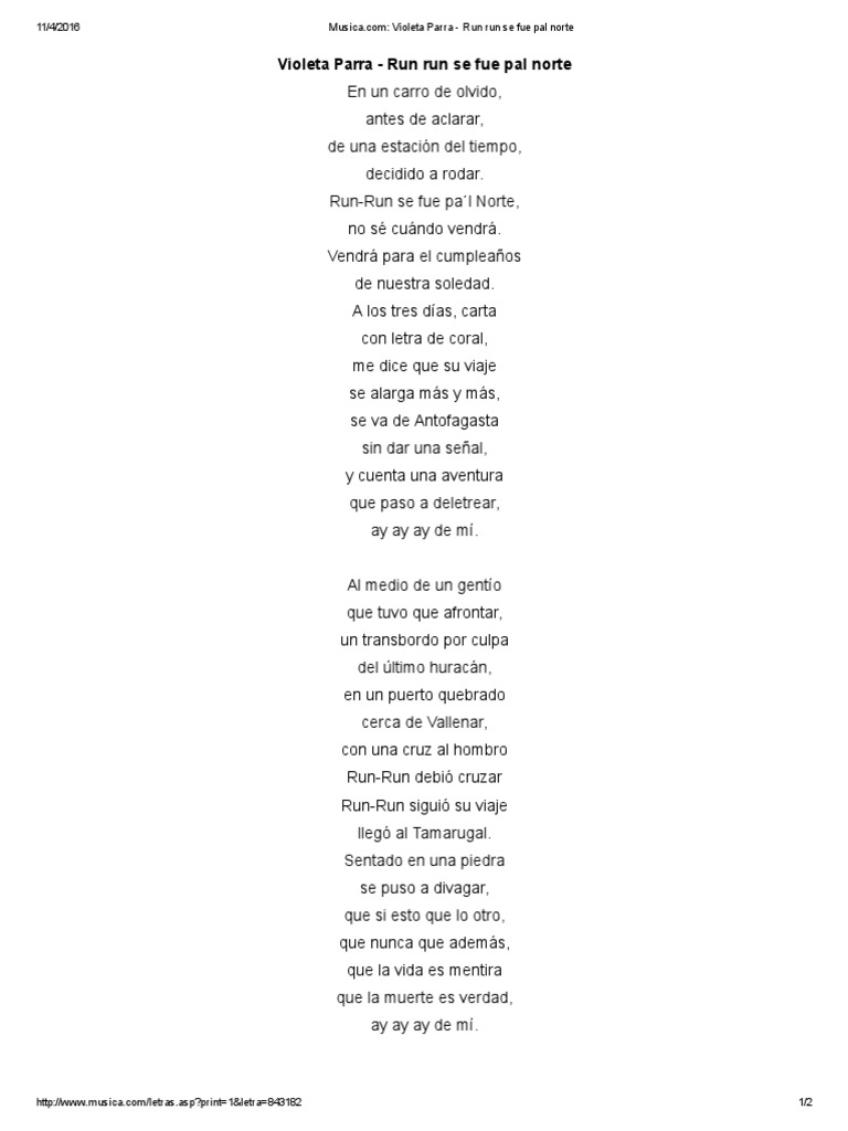 letra de Run run se fue pal norte de Violeta Parra ... 😈