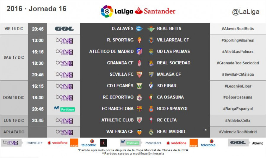 Liga Santander 2016/2017, horarios confirmados de la jornada 16 Nuevo ... 馃槇
