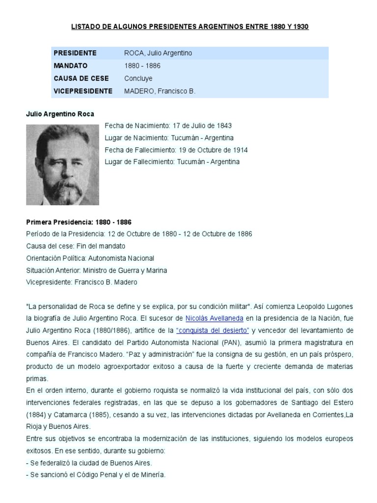 Listado de Presidentes Argentinos Entre 1880 y 1930 | Argentina | Gobierno 😈