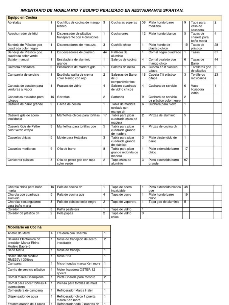 Inventario De Mobiliario Y Equipo Realizado En Restaurante Spartan ... 😈