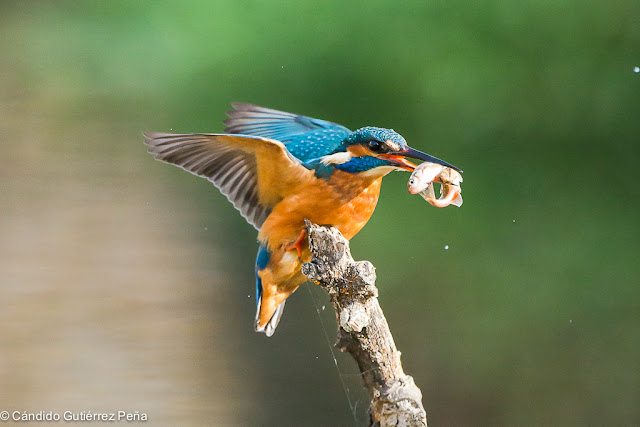 Martín pescador en vuelo con un pez en su pico volando ... 😈
