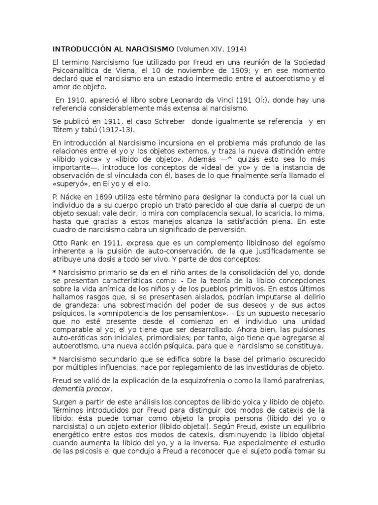 Resumen Narcisismo | PDF | Libido | Carné de identidad 😈