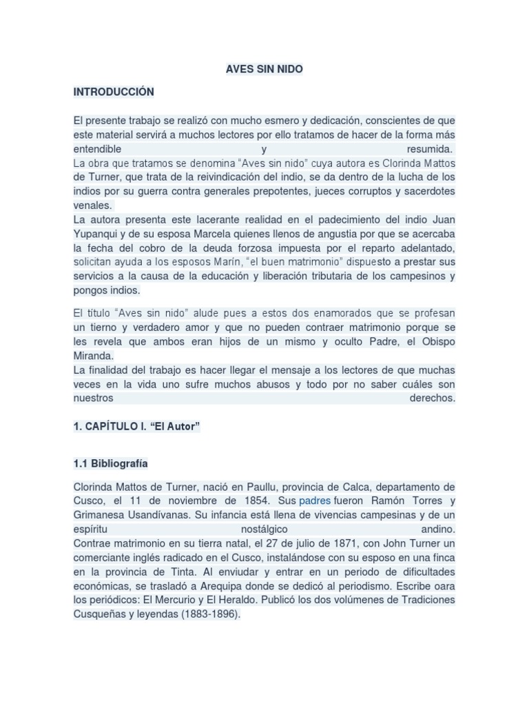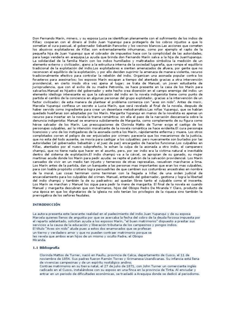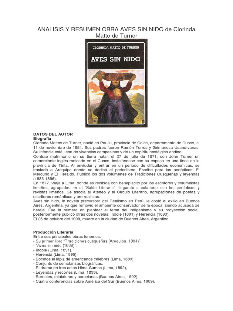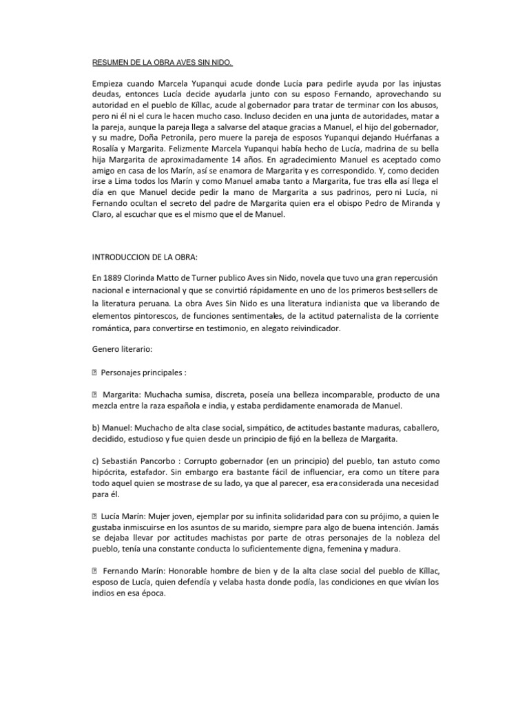 DOC RESUMEN DE LA OBRA AVES SIN NIDO | Fernando Chavez Academia.edu 😈