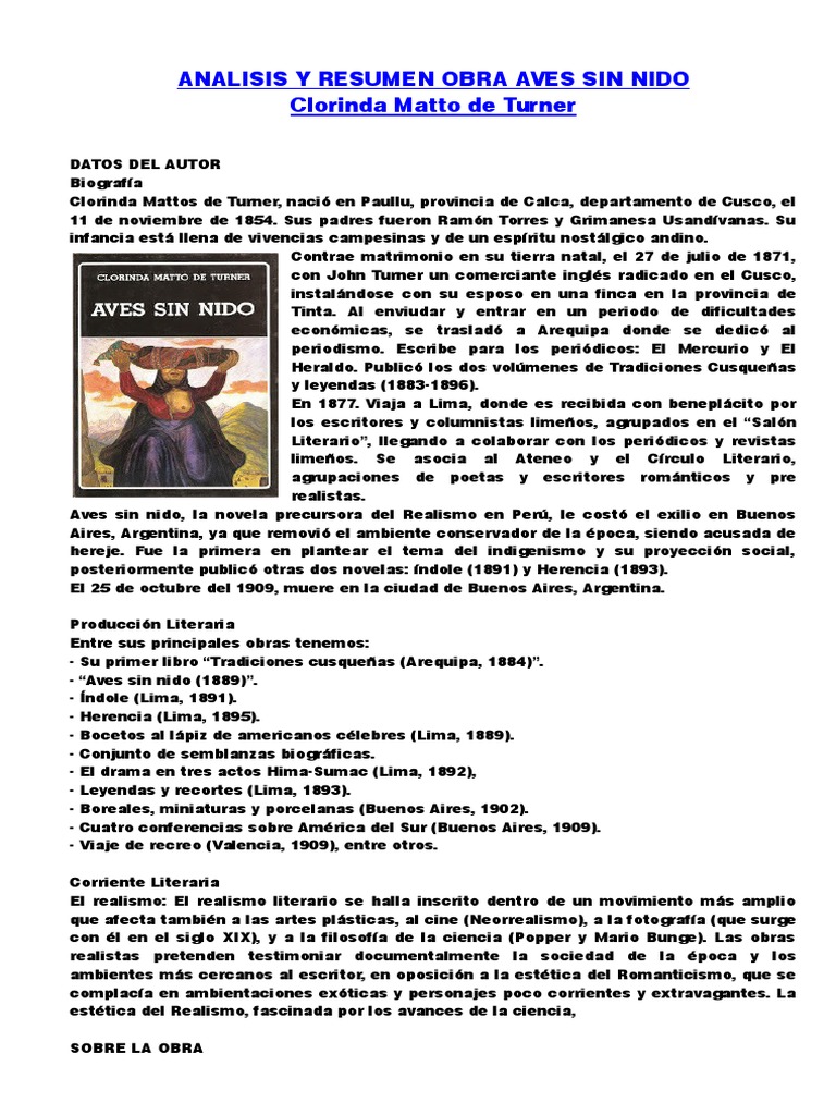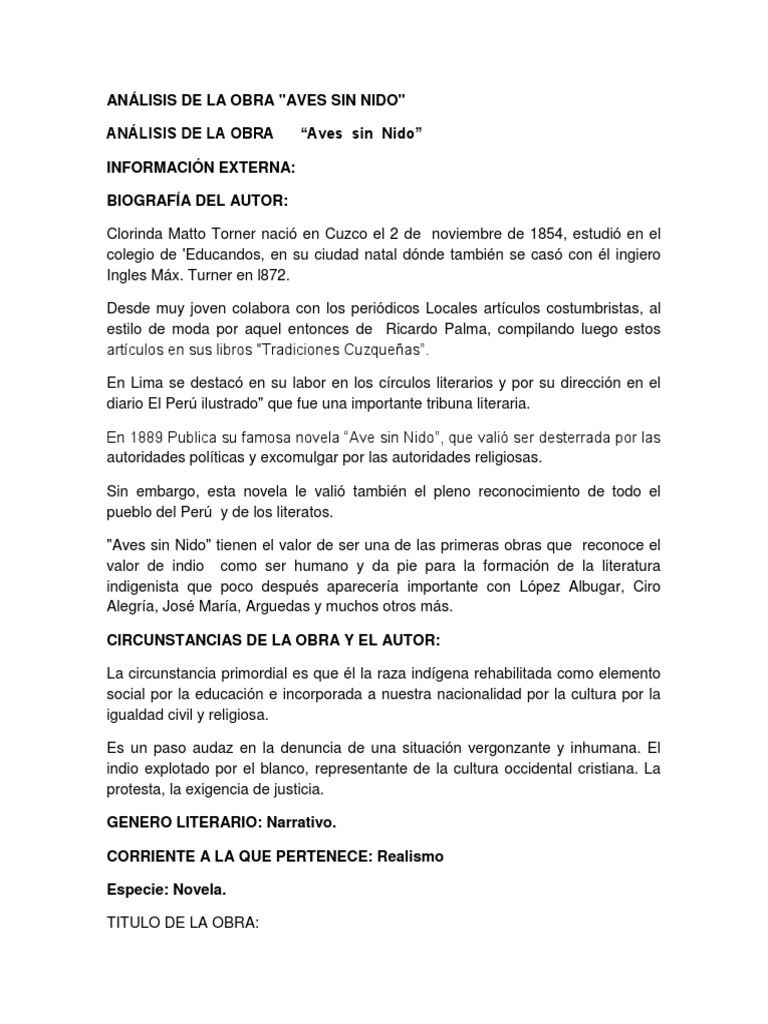 Análisis y Resumen Obra Aves Sin Nido | PDF | Realismo literario | Science 😈