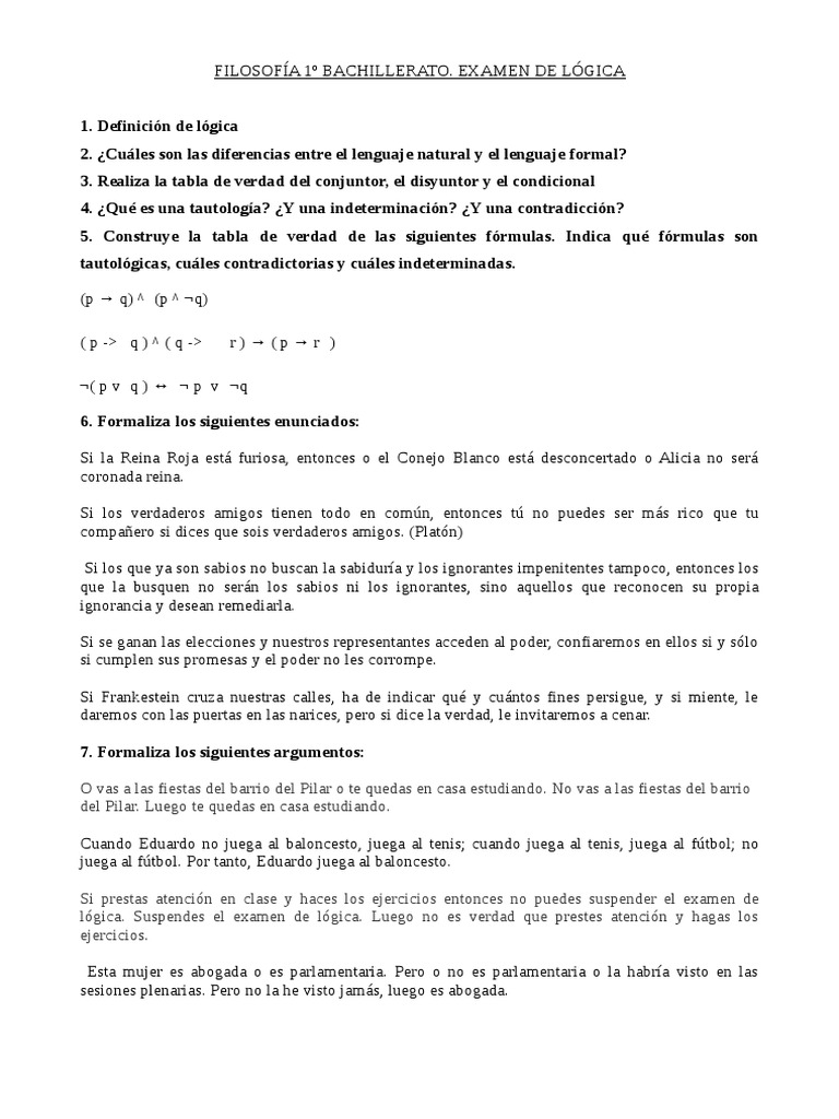 Filosofía 1º Bachillerato. Examen de Lógica 😈