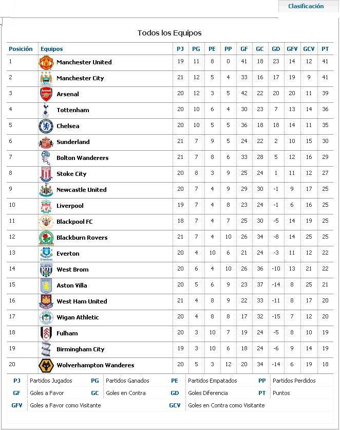 Tabla De Posiciones Del Fútbol Ingles temporada 2010 ... 😈