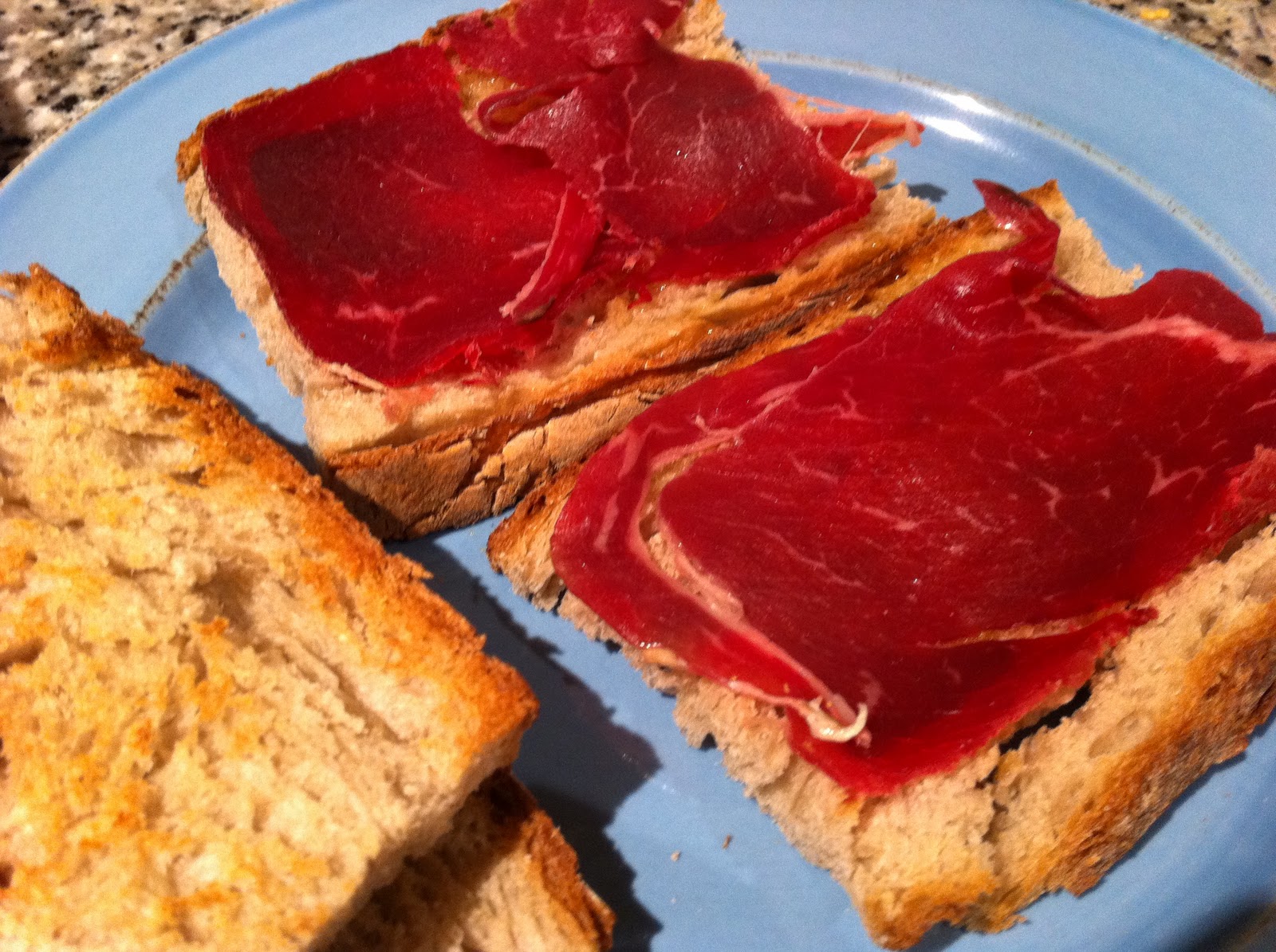 Tosta de mermelada de higo, queso del país, cecina y Gotas ... 😈