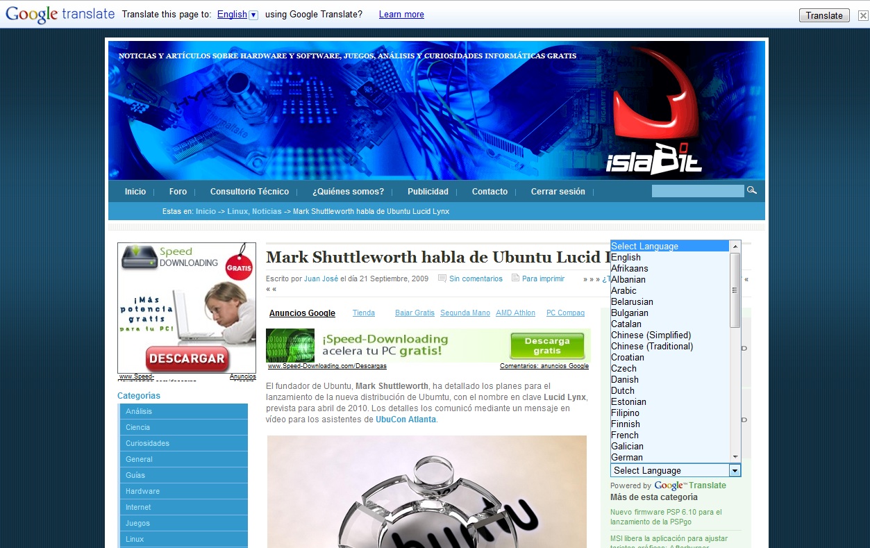 Google Traductor Gadget para las páginas webs islaBit 😈