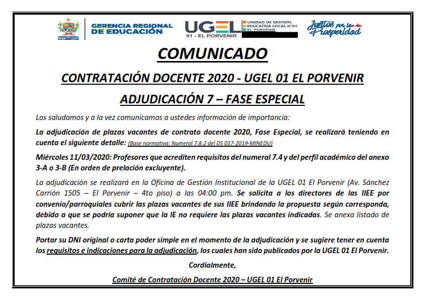COMUNICADO CONTRATACIÓN DOCENTE 2020 UGEL 01 EL PORVENIR ... 😈