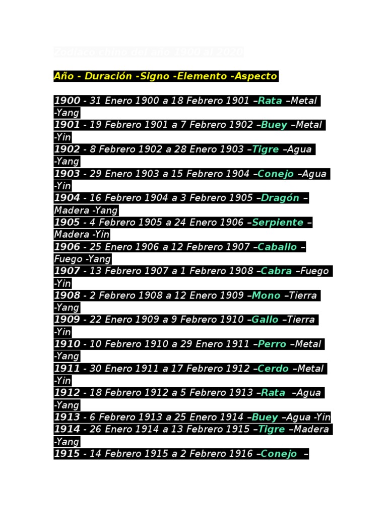 Zodiaco Chino Del Año 1900 Al 2020 | Sicología y ciencia ... 😈